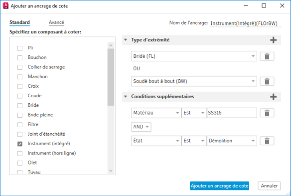 Configure les composants de tuyauterie lors de l’ajout d’un ancrage à une cote ou d’une exclusion.
