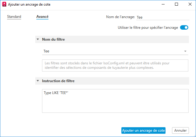 Permet de filtrer des ancrages spécifiques de manière à sélectionner un filtre existant comme ancrage ou exclusion de cote. Les filtres sont stockés dans le fichier IsoConfig.xml et peuvent être utilisés pour identifier des sélections de composants de tuyauterie plus complexes.