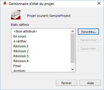 Répertorie les états qui ont été définis pour le projet en cours. Vous pouvez ajouter, renommer et supprimer des états dans la liste de cette boîte de dialogue. La liste par défaut comporte les états suivants :