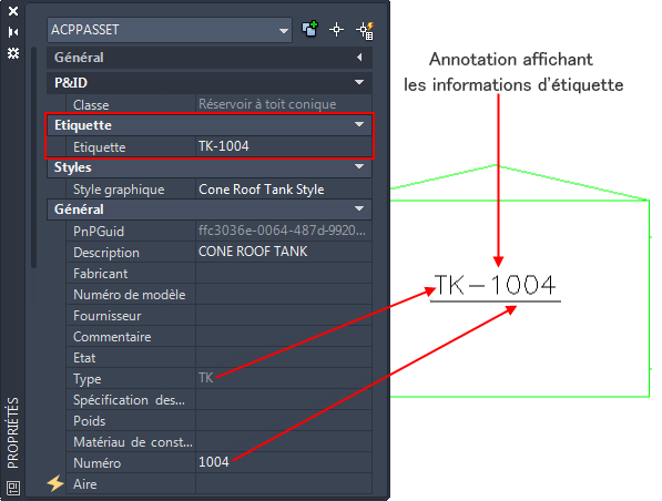 | Un identifiant unique d'un composant ou d'un segment de ligne | Les informations sur un composant ou un segment de ligne qui s'affichent dans un dessin |