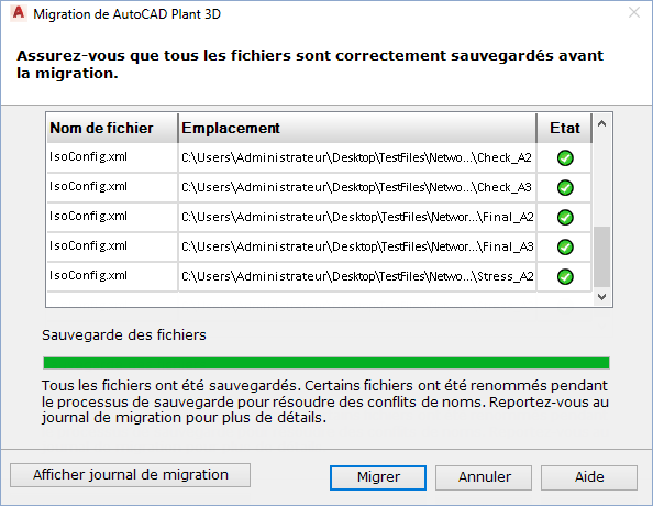 Lorsque vous choisissez de sauvegarder des fichiers de projet, l'assistant Migration du projet effectue automatiquement la sauvegarde. Cette sauvegarde inclut des fichiers requis pour le projet, ainsi que tous les fichiers supplémentaires que vous avez choisi d'ajouter à la sauvegarde. Le tableau affiche de façon dynamique le nom et le chemin d'accès de chaque fichier.
