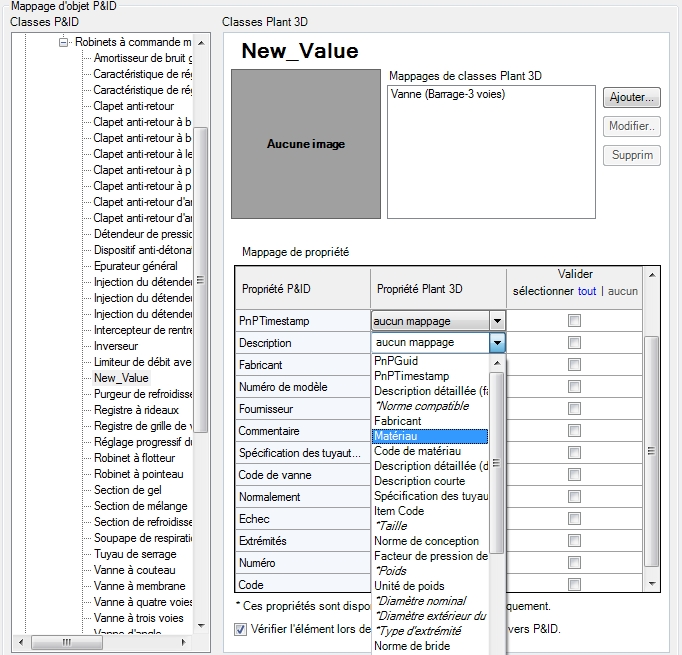 - Dans le volet Mappage d'objets P&ID, sous Classes P&ID, développez l'arborescence et cliquez sur le nouvel objet P&ID (p. ex. Nouvelle_Vanne).