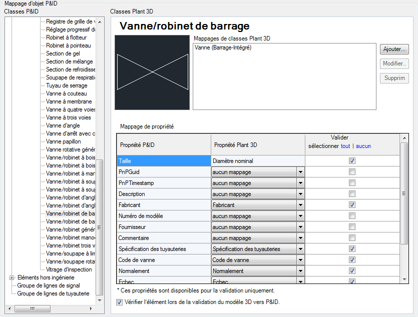 - Dans le volet Mappage d'objets P&ID, sous Classes Plant 3D, dans la table Mappage de propriété, effectuez les opérations suivantes :