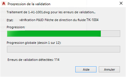 Le processus de validation prend quelques minutes, en fonction de la taille du projet ou du dessin, ou du nombre de dessins du projet. Des indicateurs de progression montrent le temps pris pour la validation.