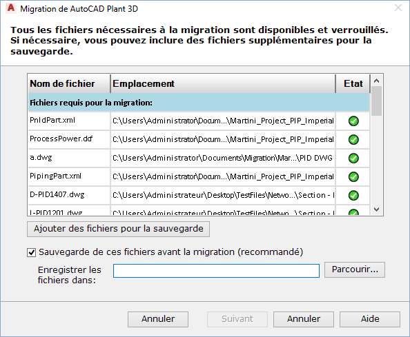 Le système recherche tous les fichiers nécessaires à la réussite de la migration du projet AutoCAD P&ID 2009. Le tableau affiche de façon dynamique le nom, le chemin d'accès et l'état de chaque fichier.