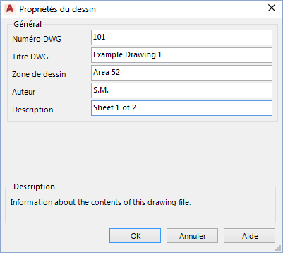 - Sous Description, entrez une description (p. ex. Le projet auquel ce dessin appartient).