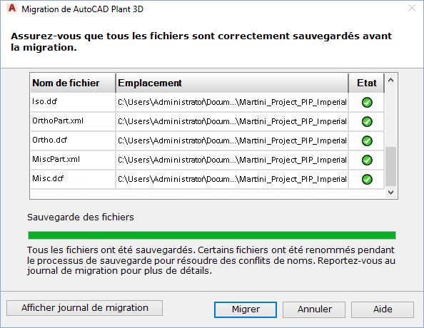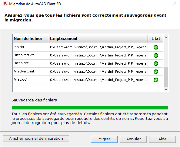 - Cliquez sur Suivant. La page de sauvegarde de l'assistant Migration du projet affiche la progression de la sauvegarde et indique si l'opération réussit pour chaque fichier.