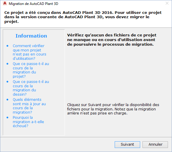 - Vérifiez que le projet et les fichiers dessin associés sont fermés. Dans la page Lancement de migration de projet, cliquez sur Suivant.