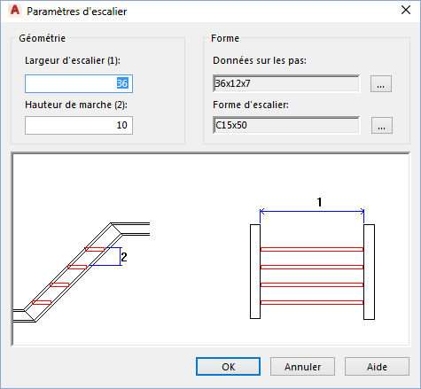 Modifie les options de forme d'escalier, telles que la norme de matériau, le type et la taille définis dans la boîte de dialogue Sélectionner la forme d'escalier.
