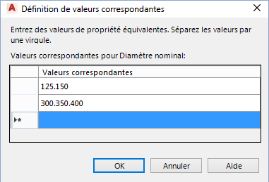 Identifie les valeurs de propriété compatibles. Vous pouvez ajouter des valeurs séparées par une virgule sur chaque ligne (p. ex. 125, 150) pour indiquer une correspondance.
