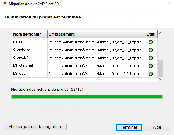 La migration peut prendre du temps, selon la taille du projet et le nombre de dessins associés. Le tableau de progression de la migration rend compte de la réussite ou de l'échec de la migration des fichiers et indique la progression de la migration. Une fois tous les fichiers migrés, le projet s'ouvre dans AutoCAD Plant 3D toolset.