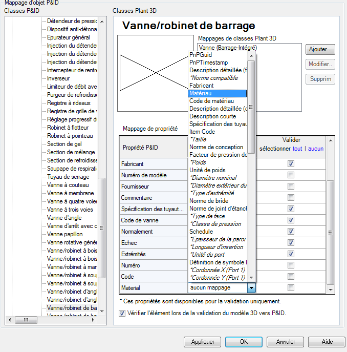 - Dans la liste déroulante de la colonne Propriété Plant 3D, cliquez sur la propriété 3D correspondante (p. ex. Matériau).