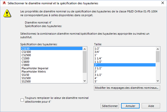 - Si le diamètre nominal et la spécification des tuyauteries ne correspondent pas, effectuez les opérations suivantes dans la boîte de dialogue Sélectionner le diamètre nominal et la spécification des tuyauteries :