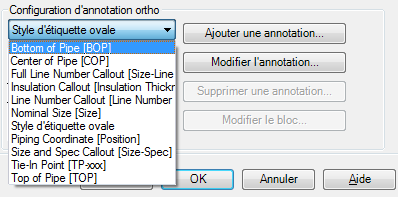 - Sous Configuration d'annotation ortho, sélectionnez une annotation dans la liste déroulante. Par exemple, Bas du tuyau (BOP). Cliquez sur Ajouter une annotation. Il est toujours recommandé de modifier une copie plutôt que l'original.