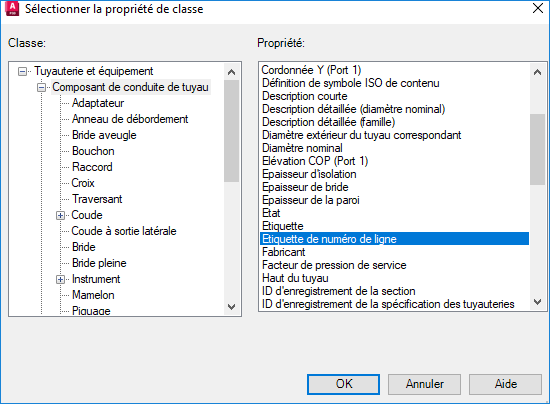- Dans la boîte de dialogue Sélectionner la propriété de classe, sous la liste Classe, cliquez sur Composant de conduite de tuyau.
