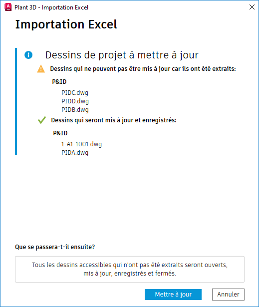La boîte de dialogue Importation Excel affiche la progression de l’importation et des informations lorsque certains dessins concernés sont extraits ou ne peuvent pas être mis à jour. Cliquez sur Mettre à jour pour extraire tous les dessins concernés, importer des données depuis Excel vers le Gestionnaire de données et mettre à jour les dessins concernés.