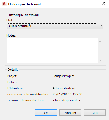 Vous pouvez également entrer un état et des notes dans la boîte de dialogue Historique de travail si votre administrateur de projet a configuré cette dernière de manière à ce qu'elle s'affiche lorsque vous ouvrez ou fermez un dessin. Notez qu'il ne s'agit pas d'un mécanisme de stockage, de récupération ou de contrôle des versions d'un dessin.