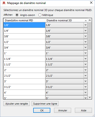 - Si vous souhaitez modifier les mappages des diamètres nominaux mais que cette boîte de dialogue ne s'affiche pas, entrez plantpidsizemapping sur la ligne de commande.