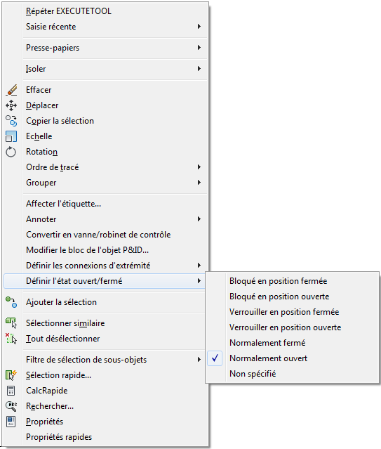 Cliquez avec le bouton droit sur la vanne. Cliquez sur Définir l'état ouvert/fermé et sélectionnez un état (p. ex. Bloqué en position ouverte).