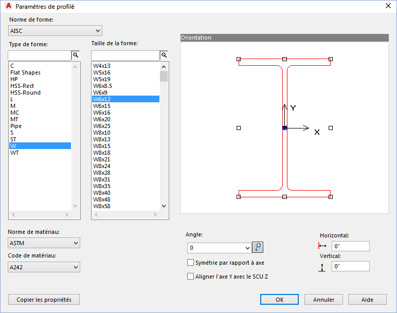 Dans la liste Norme de matériau, choisissez la norme de matériau à utiliser pour les nouveaux profilés.