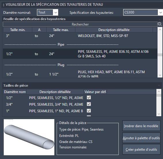 Affiche la spécification des tuyauteries courante dans AutoCAD Plant 3D toolset et permet d'ouvrir et d'afficher une feuille de spécification des tuyauteries, d'insérer des pièces de cette feuille dans un modèle, ainsi que de modifier les palettes d'outils.