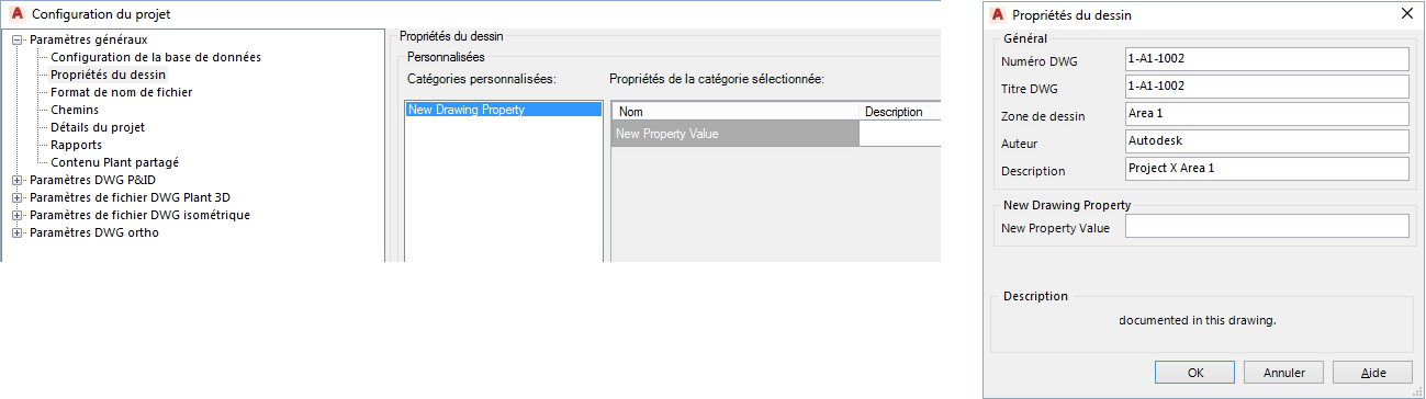 Lors de la configuration d'un projet, des propriétés peuvent être ajoutées dans la configuration du projet affichée pour chaque dessin.