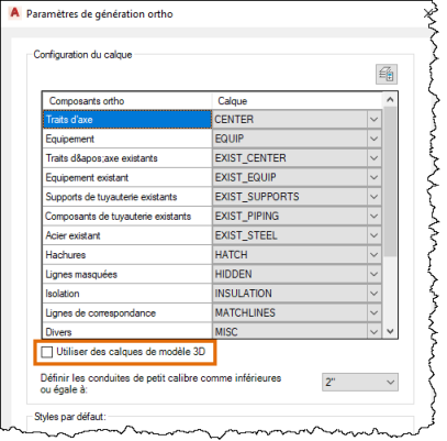 Dans la boîte de dialogue Paramètres de génération ortho, sélectionnez le calque sur lequel les différents composants orthographiques devront être affichés. Par exemple, sélectionnez le calque TUYAU pour la tuyauterie de sorte que tous les composants de tuyauterie soient affichés sur ce calque. Il permet également de définir les objets orthographiques sur DuCalque pour les paramètres de couleur et de type de ligne. Ainsi, ces objets héritent de la couleur et du type de ligne du calque TUYAU.