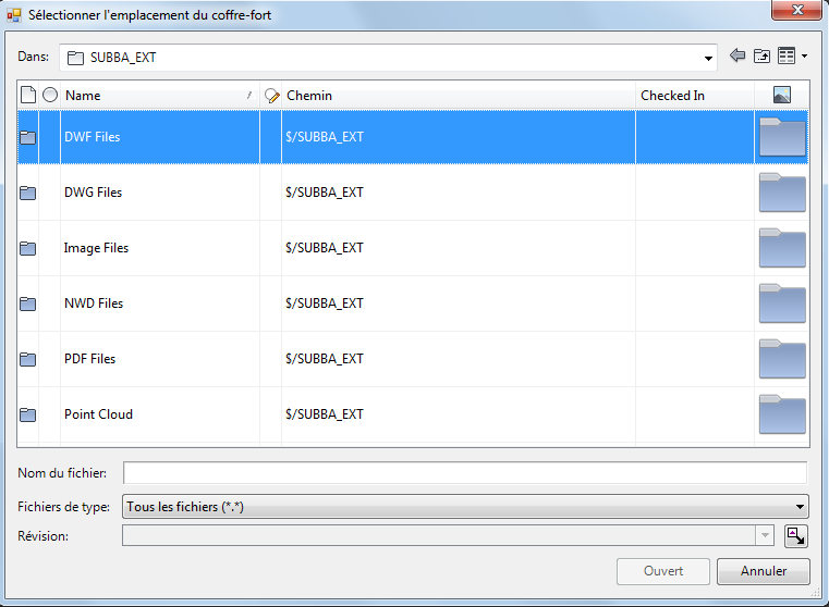Vous pouvez attacher une référence externe, directement depuis le coffre-fort. Les fichiers AutoCAD DWG, ainsi que d'autres types de fichiers tels que les fichiers PDF et NWD sont pris en charge.