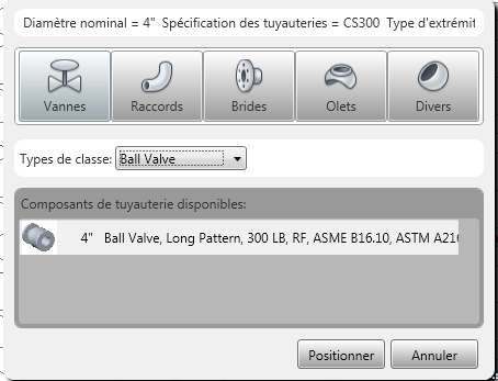 Dans la liste Composants de tuyauterie disponibles, cliquez sur un composant (p. ex. Vanne/robinet à boisseau sphérique, Motif long, 300 lb, RF).