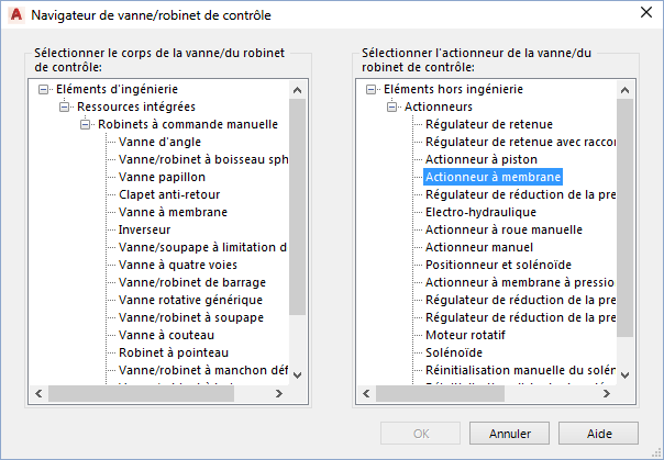 Sélectionne un corps de vanne/robinet de contrôle et un actionneur pour une vanne/un robinet de contrôle que vous placez dans un dessin.