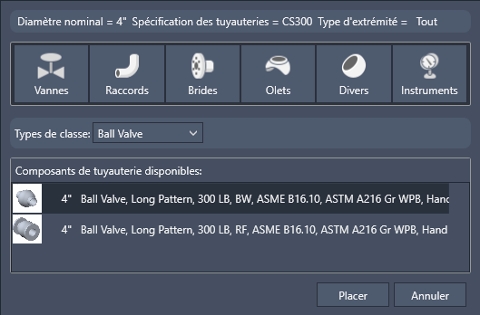 Spécifie le composant à placer. Affiche la liste des composants de tuyauterie correspondant à la spécification des tuyauteries, au diamètre nominal, au type d'extrémité et à la classe courants.