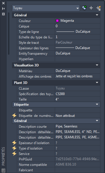 Dans la palette des propriétés, vous pouvez modifier les données d'un objet (comme une spécification de tuyauterie, un type d'isolation ou son épaisseur, etc.). La palette des propriétés permet également d'accéder à la boîte de dialogue Affecter une étiquette, dans laquelle vous pouvez modifier les informations d'étiquette.