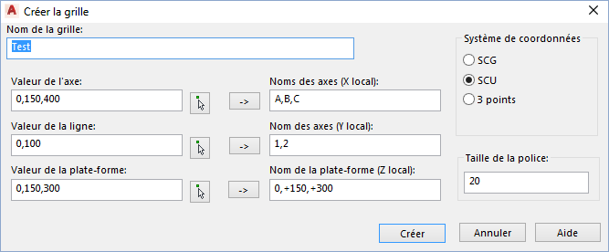 Sous Système de coordonnées, cliquez sur SCG, SCU ou 3 points pour définir le système de coordonnées à utiliser pour créer la grille. Si vous choisissez 3 points, spécifiez l'origine et la direction des trois axes de la grille.