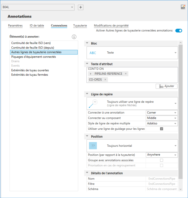 - Au bas de la liste Éléments à annoter, cliquez sur Ajouter pour ajouter une nouvelle annotation de tuyauterie.
