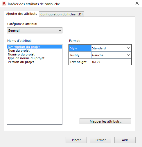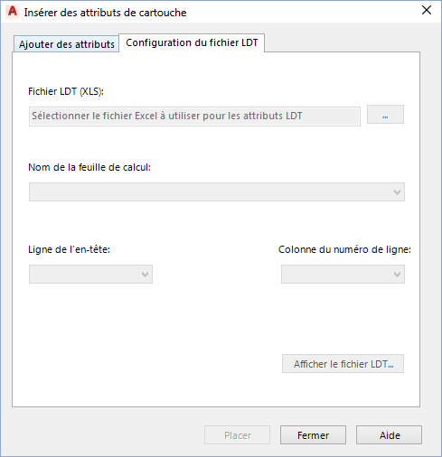 - Dans la boîte de dialogue Insérer des attributs de cartouche, cliquez sur l'onglet Configuration du fichier LDT et effectuez les opérations suivantes :