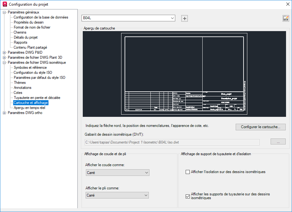 - Dans l'arborescence Configuration de projet, développez Paramètres de fichier DWG isométrique. Cliquez sur Cartouche et affichage.
