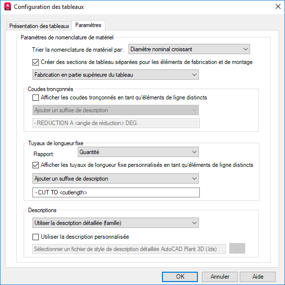 • Sélectionnez ou désélectionnez Utiliser la description personnalisée. Si vous sélectionnez cette option, cliquez sur le bouton [...] pour localiser le fichier de style de description détaillée (.lds) des AutoCAD Plant 3D toolset voulu. Ce fichier définit le format de toutes les descriptions utilisées dans la nomenclature de matériel. Cliquez sur OK.