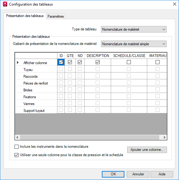 • Sélectionnez Utiliser une seule colonne pour la classe de pression et le schedule afin de combiner les propriétés de schedule et de classe de pression dans une colonne.