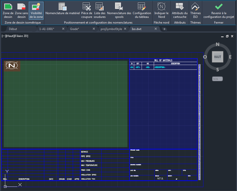 • Pour placer un tableau (nomenclature de matériel, nomenclature des débits, liste de soudure ou nomenclature des spools) : dans le ruban, groupe de fonctions Positionnement et configuration des nomenclatures, cliquez sur le tableau souhaité, puis tracez sa position dans le dessin, généralement dans la zone de tableaux bleue.