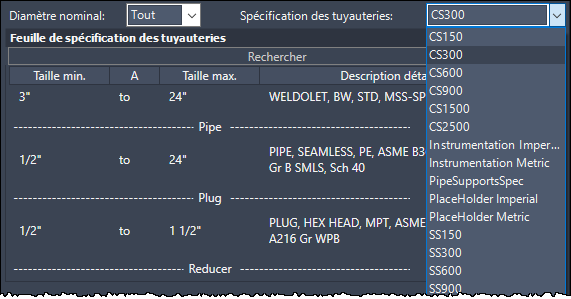 Dans la liste déroulante, cliquez sur une spécification des tuyauteries (p. ex. CS300).