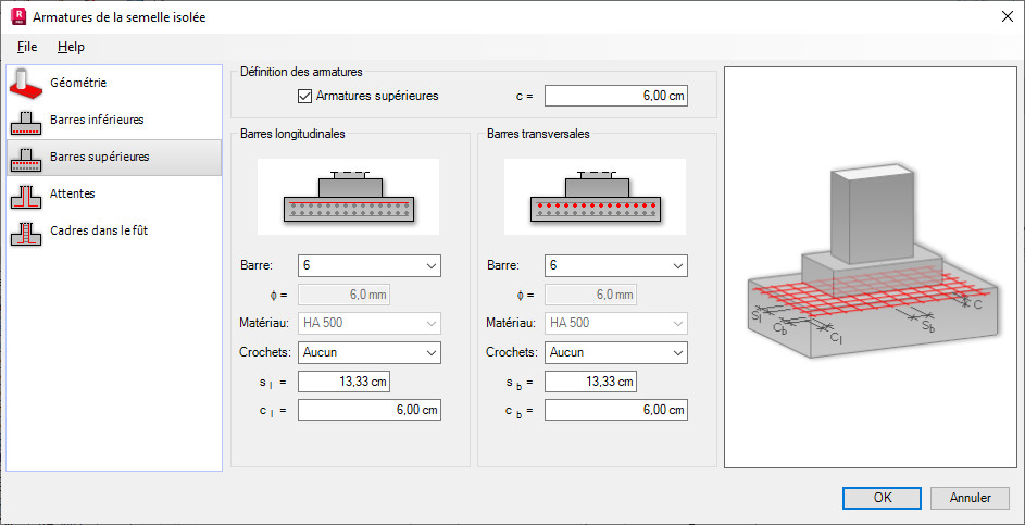 Pour générer l'armature supérieure d'une semelle, choisissez Armatures sup. sous Armatures-définition. Vous pouvez ensuite définir les paramètres de l'armature supérieure :