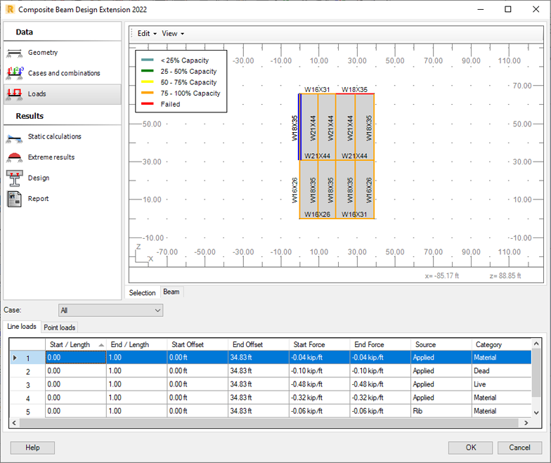 - Sélectionnez l’onglet Beam dans la fenêtre graphique et examinez chaque cas et combinaison de charges.