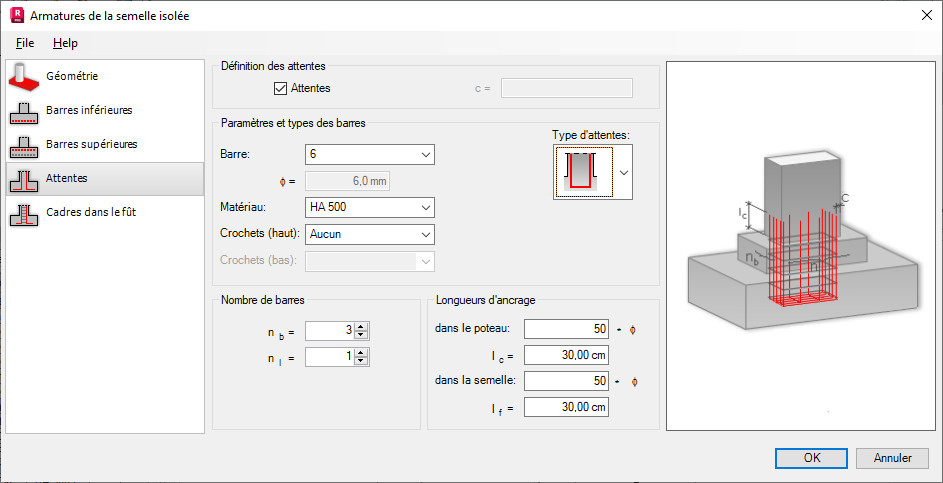 Pour générer une armature par attente dans une semelle isolée, sélectionnez Attentes sous Définition des attentes. Vous pouvez ensuite définir les paramètres de l'armature :