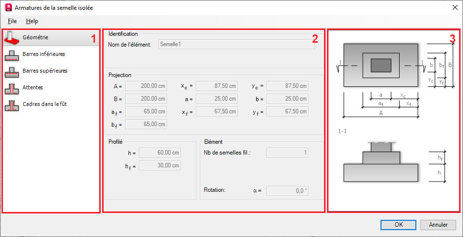 La boîte de dialogue d'armature de semelles isolées se compose de trois éléments principaux :