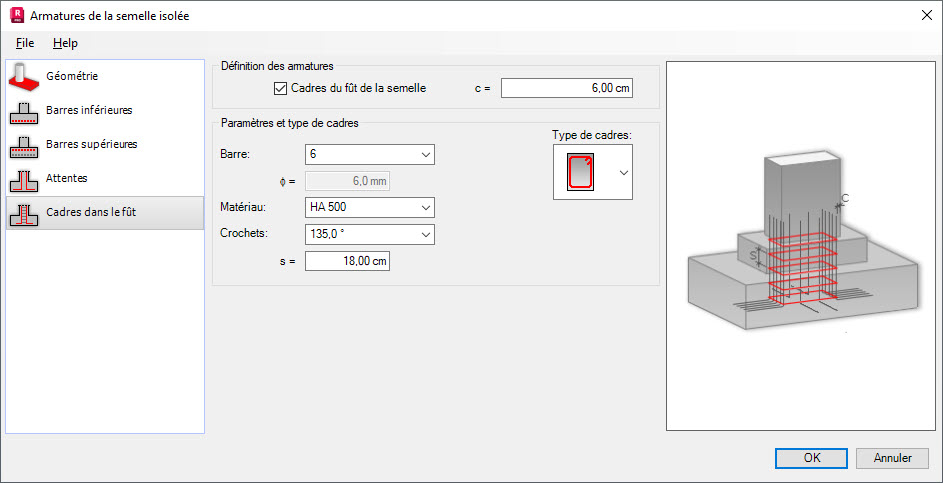 Pour générer une armature de cadre, sélectionnez Cadres du fût de la semelle sous la définition des armatures. Vous pouvez ensuite définir les paramètres du cadre :