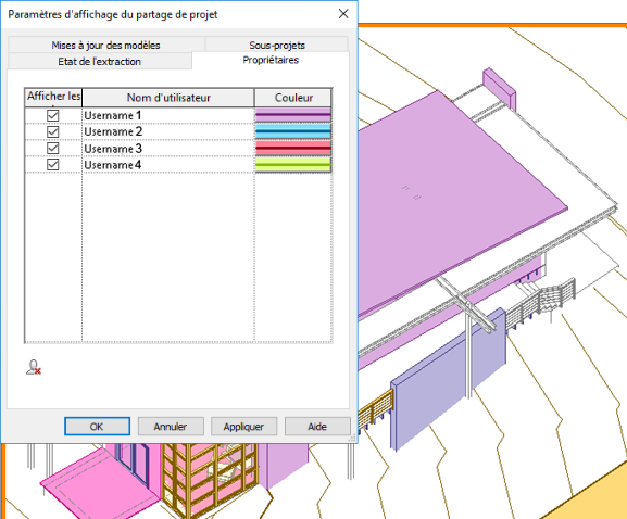 Paramètres d'affichage du partage de projet. La couleur spécifiée pour le propriétaire correspondant s'affiche dans le modèle.