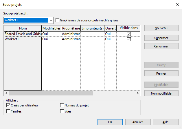Lorsque le partage de projet est activé, le système crée plusieurs sous-projets par défaut (deux sous-projets utilisateur par défaut et d'autres sous-projets pour les familles chargées dans le projet, les normes et les vues du projet).