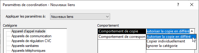 Avant ou lors de la copie d'appareils à partir d'un modèle lié vers un modèle MEP, spécifiez le comportement de copie de chaque catégorie d'appareils dans la boîte de dialogue Spécification des paramètres de coordination.