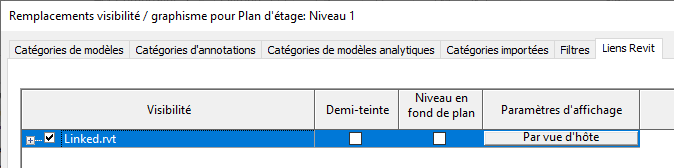 Si l'option Par vue d'hôte ne s'affiche pas, cliquez dans la colonne Paramètres d'affichage. Dans l'onglet Outils de base de la boîte de dialogue Paramètres d'affichage des liens RVT, sélectionnez Par vue d'hôte, puis cliquez sur OK.
