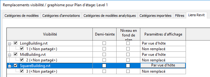 Paramètres d'affichage : options permettant de remplacer des paramètres supplémentaires pour chaque modèle lié dans la vue d'hôte active. Le bouton affiche l'état actuel des paramètres d'affichage (Par vue d'hôte, Par vue liée ou Spécifique).